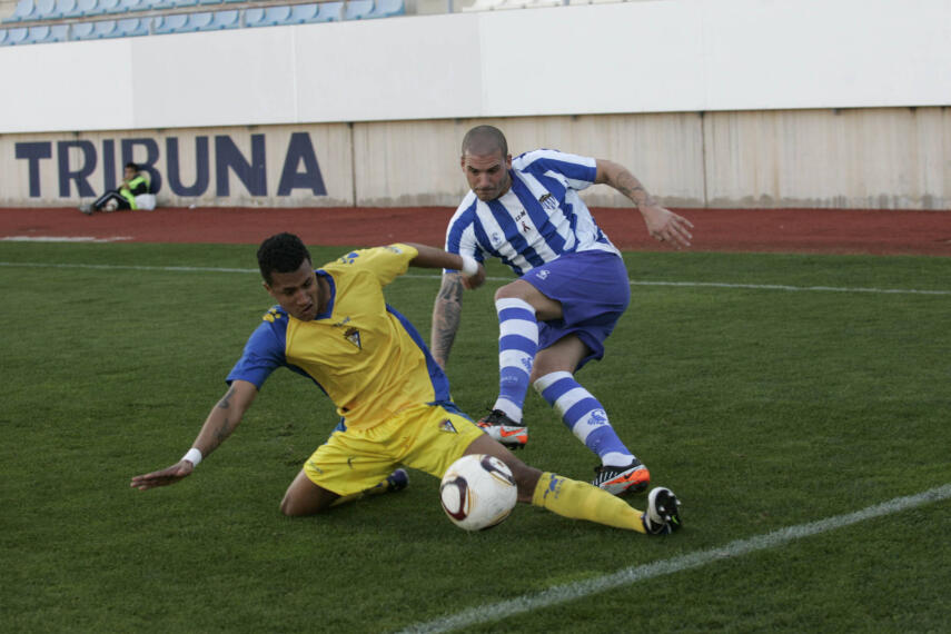 El partido empezó con dominio visitante. El Cádiz jugaba como si le fuera la vida en el envite, con continuo acoso sobre la portería de Manolo. Tanto fue el cántaro a la fuente que en el minuto quince se rompió. Fue Ikechi el que inauguró el marcador con un disparo centrado al que nada pudo hacer el guardameta del Lorca Atlético. El partido se volvió lorco por instantes, porque dos minutos más tarde empató el Lorca. Un centro de Nico fue aprovechado por Hugo Salamanca, que fusiló a placer al meta Aulestia. Con el paso de los minutos fue el Cádiz el que volvió a la carga, haciendo estragos por la banda izquierda. A los 39 minutos llegó el segundo gol del Cádiz, un centro de Ikachi fue rematado por Héctor Yuste desde la frontal y el balón entró en la portería de Manolo junto al palo. Nuevo mazazo para un Lorca que no encontraba la forma de llegar a la portería de Aulestia para crearle peligro. Terminó el primer tiempo con la mínima ventaja de los gaditanos.